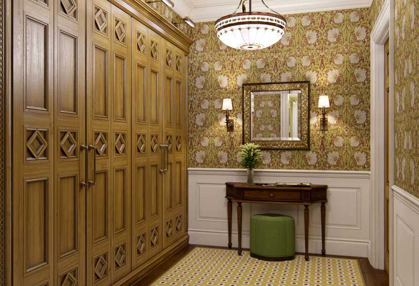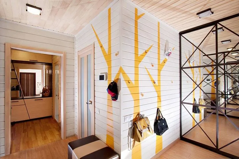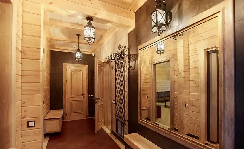 Оформляя прихожую, стоит помнить о практичности. Выбирая покрытие для стен, нужно помнить о том, что прихожая – одно из самых загрязняемых помещений. Краска для стен, текстильные или бумажные обои будут очень легко загрязняться, и отмыть их будет проблематично. Такой ремонт будет недолговечным. Виниловые обои – неплохое решение, но наиболее долговечной будет отделка из бруса. Она не только очень красива, но и долговечна. Вымыть её легко, можно даже использовать неабразивные моющие средства. А впишется она в любой дизайн. Кантри, прованс, классика и другие стили предполагают использование дерева.