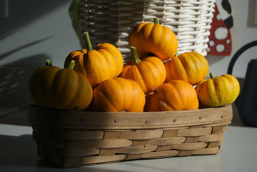 Кроме того, есть также миниатюрные тыквы, которые можно поместить в одну большую плетеную корзину или несколько маленьких, совмещая ее с другими овощами и фруктами и таким образом оформляя комнату.