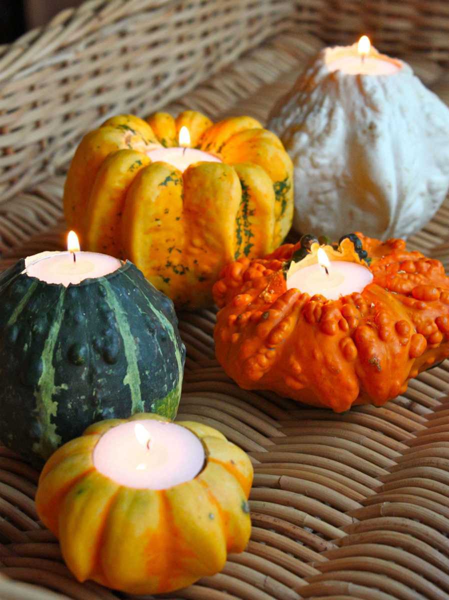 Подсвечники. Вычищают внутреннюю (семенную) часть миниатюрных тыкв и устанавливают одну или несколько чайных свечек внутрь. Этот декор комнат своими руками ненадолго, всего на насколько дней, но зато сколько положительных эмоций!