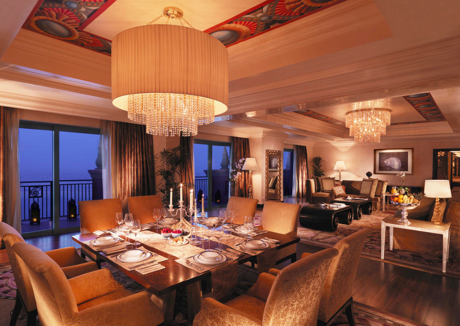 А еще у номера — отдельный вход и лифт, специальный персонал с дворецким, поваром и персональным тренером. Дополняет все это великолепие панорамный вид из окон от пола до потолка. В стоимость апартаментов включены spa-услуги, плавание с дельфинами, неограниченный доступ к самому большому аквапарку.