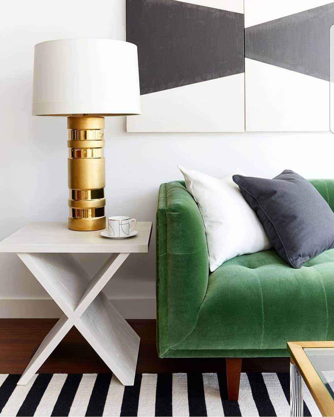 Здесь черно-белый интерьер квартиры дополнен изумрудным диваном.
