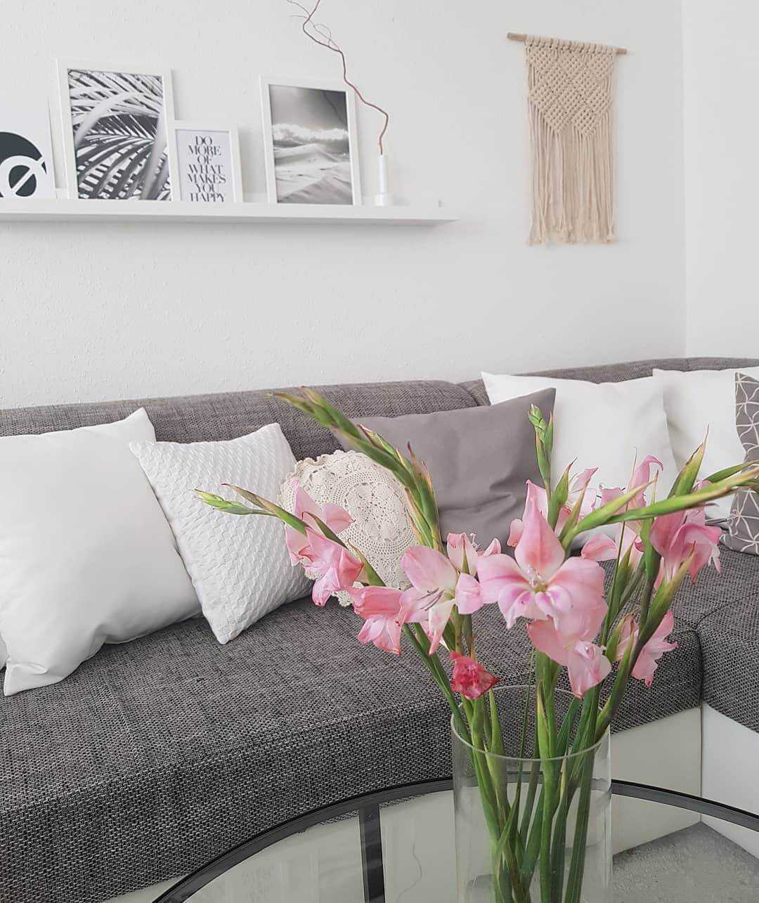 Нежные розовые гладиолусы подчеркивают легкость и воздушность гостиной.