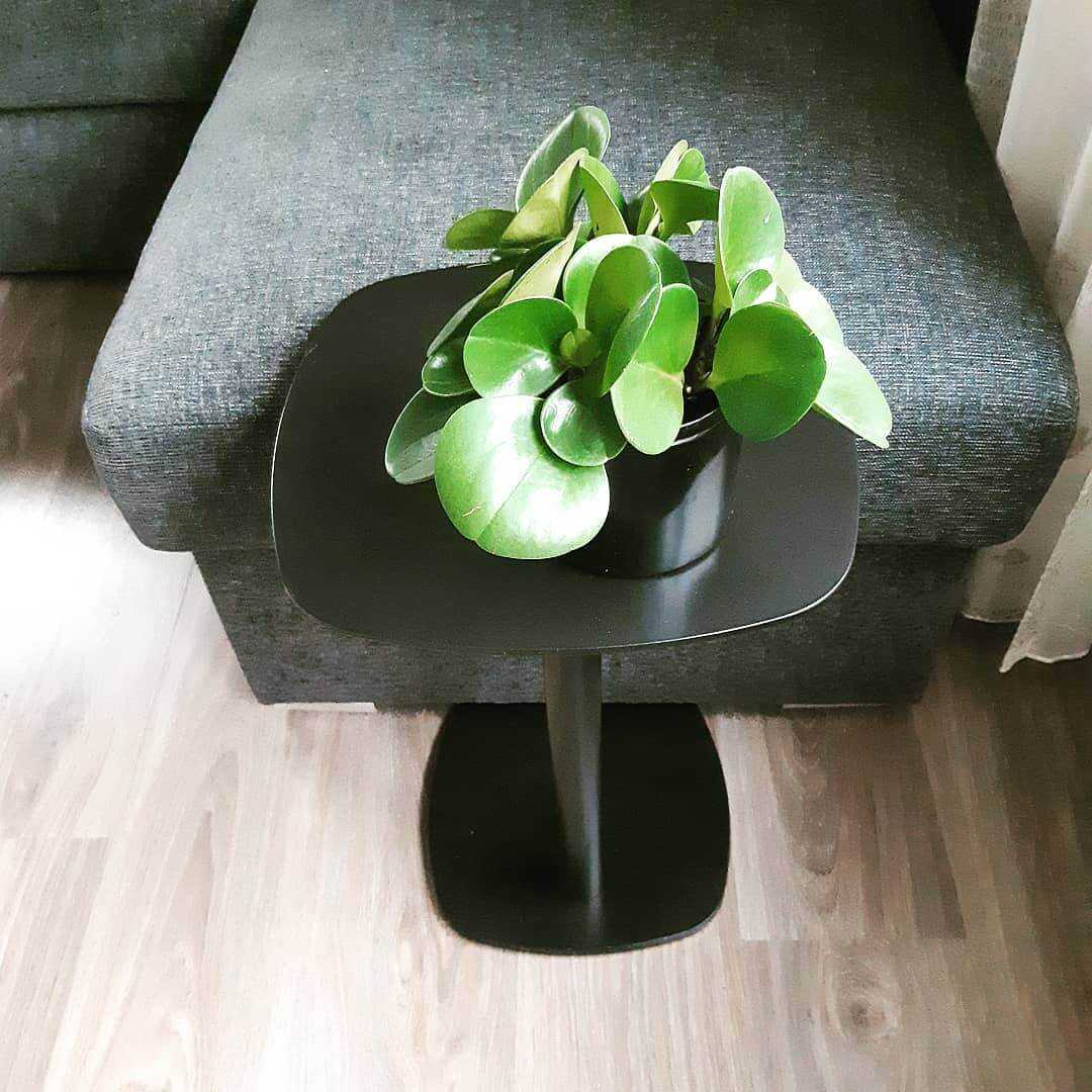 Суккулент с крупными зелеными листьями на черном столике оживляет интерьер, и в то же время усиливает его строгость.