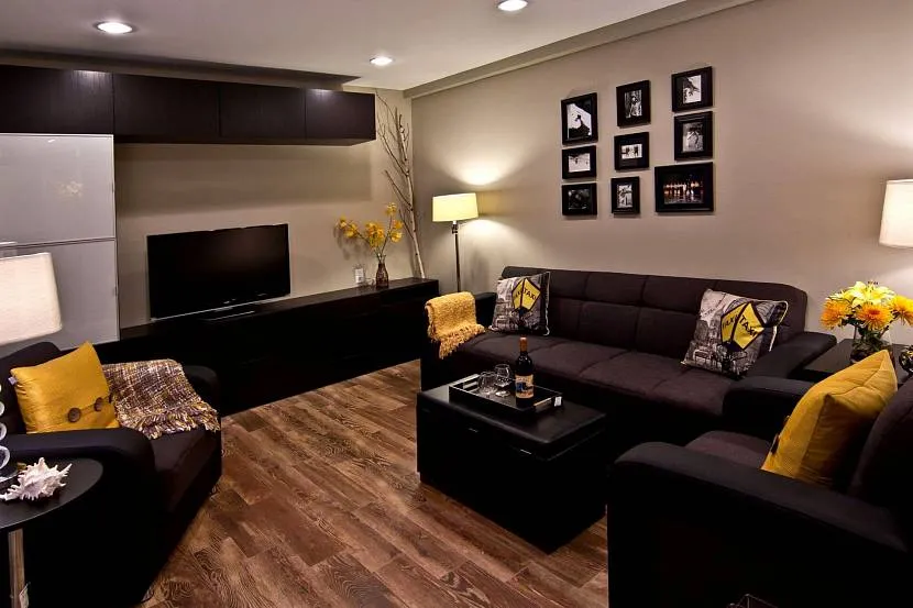Для гостиной темный цвет обычно сочетают с пастелью. Получается пространство в довольно сдержанных тонах. На фоне светлой отделки будет хорошо смотреться громоздкая мебель или большой телевизор;