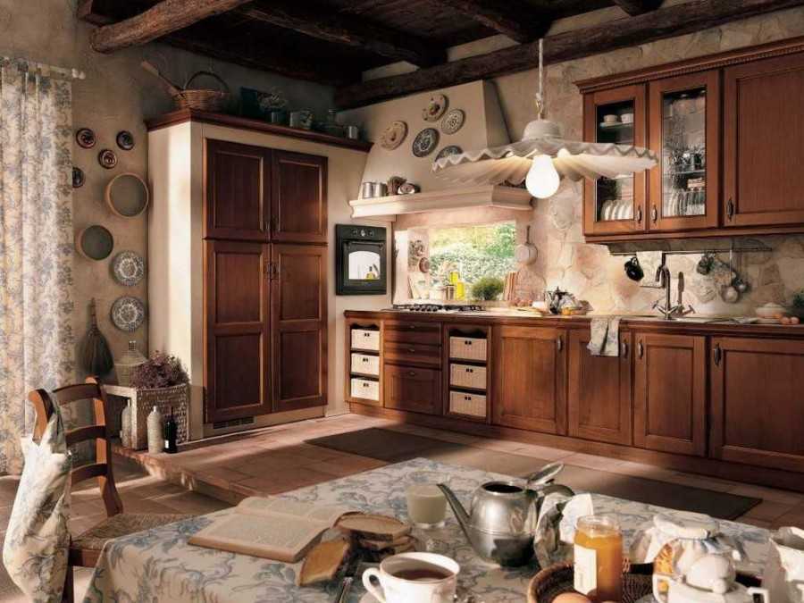 Особое внимание уделите потолочным балкам: они бывают из натурального дерева или из полиуретана «под дерево».. Продумывая дизайн кухни, помните, что из применения исключаются такие материалы, как: стекло, зеркало, пластик и линолеум, хромированный металл и пленка ПВХ
