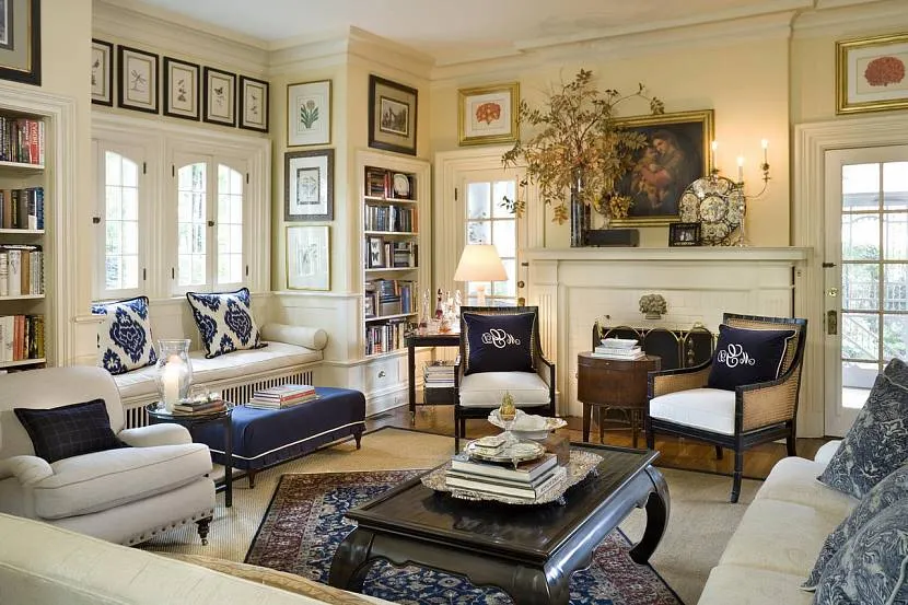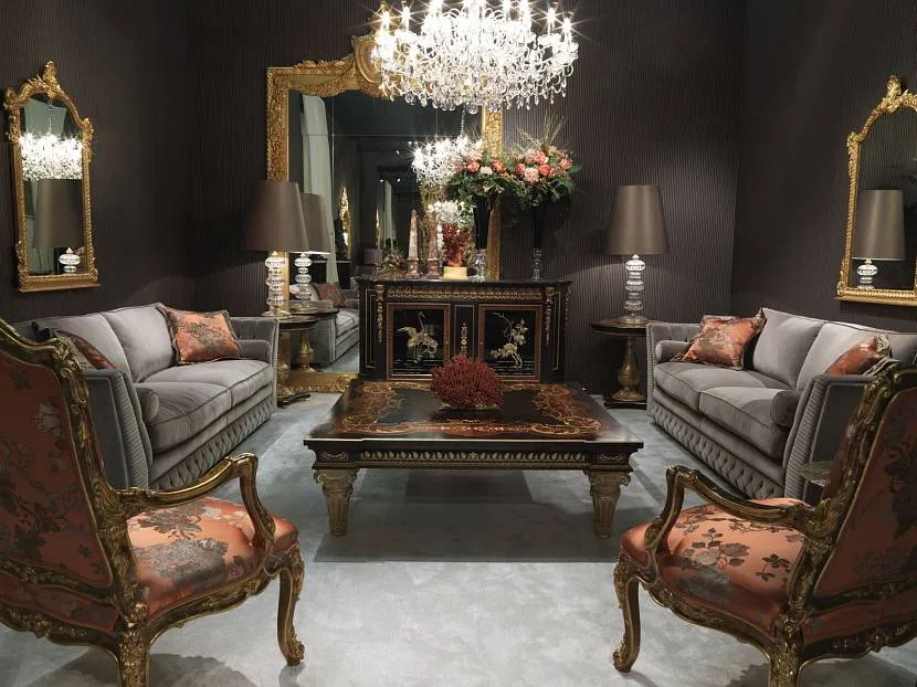 Для этого стиля подойдет мебель из любой породы, со спокойной, гармонично сочетающейся обивкой. Её роскошь и помпезность, в идеале, грамотно оттенятся «эффектом старины» – мелкими царапинами, сколами, трещинками, кракелюрным узором. Ведущим тоном комнаты предпочтительнее выбрать пастельный оттенок.