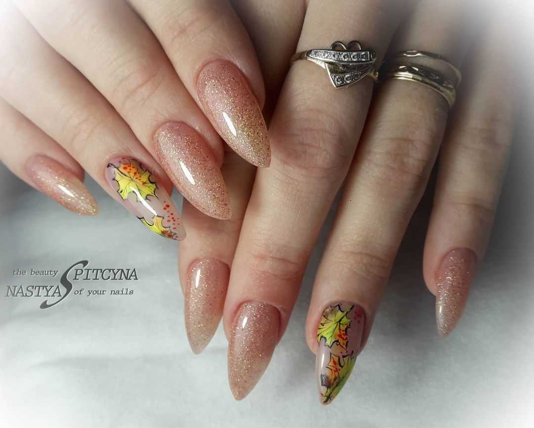 Нюдовый маникюр с листочками осенними