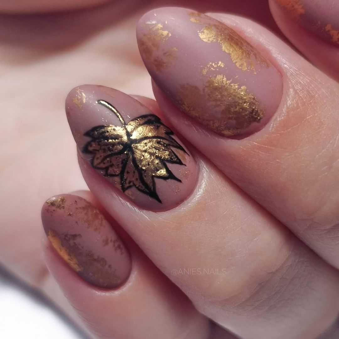 Если вы хотите, чтобы ваши художественные старания оценили, используйте для фона нюдовый оттенок лака. Маникюр на каждый день может выглядеть следующим образом: нюдовый фон + золотой кленовый лист + черная прорисовка + золотая фольга + матовый финиш.