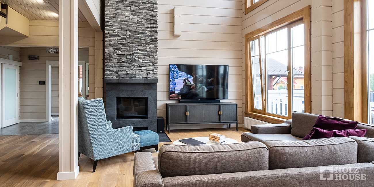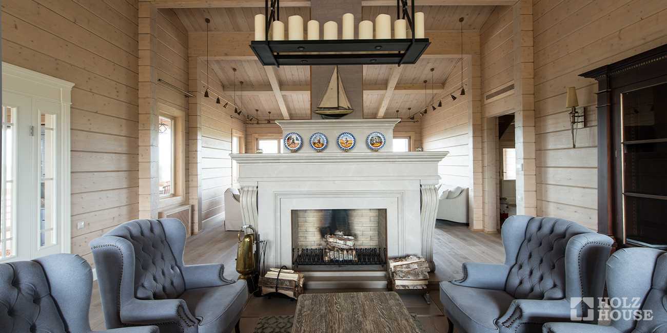 Древесина – это натуральный материал, поэтому и помещение гостиной в доме из дерева лучше оформлять с использованием природных материалов. Многие стилистические направления поддерживают такой экологичный подход, при этом имея очевидные различия между собой.