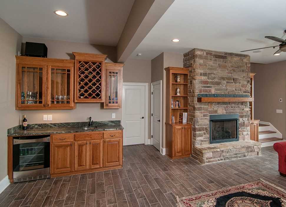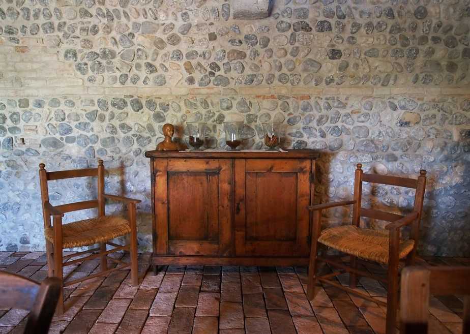 Деревянная мебель в комбинации с каменной отделкой стен и пола