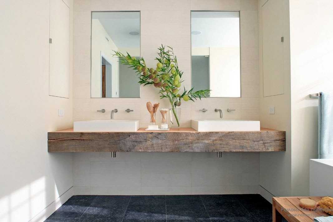 Стильно и вполне уместно смотрится даже деревянная мебель в ванной комнате.