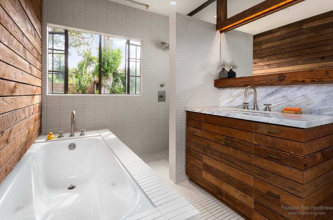 Согласно современным модным тенденциям дерево можно и нужно использовать в совершенно неожиданном качестве. Например, ванные комнаты часто дополняются деревянной отделкой, хотя раньше это решение было недопустимым.