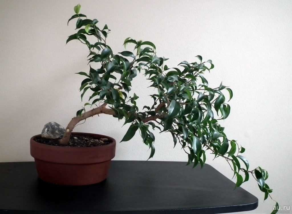 Выращивание комнатного бонсай из фикуса является самым простым способом для получения такой интересной формы растения. Подбирают плоскую удлинённую ёмкость, в которую высаживается маленький фикус. Фиксаторами для изгиба веток служит проволока и грузила. Через полгода груз можно убирать, а ветки поворачивать в другом направлении. Все виды бонсай нуждаются в обильных подкормках.