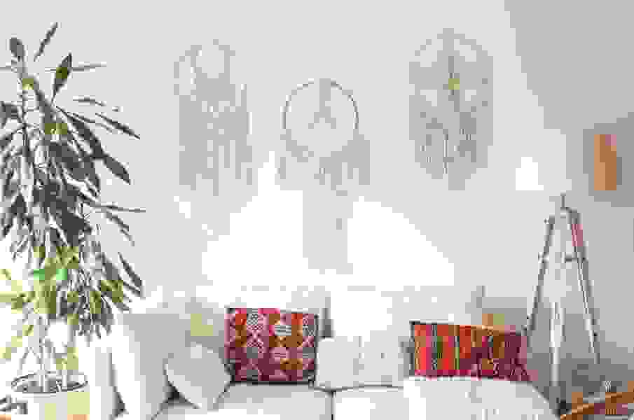 Это прекрасная альтернатива скучному изголовью спального места. Большой популярностью пользуются и ловцы снов, выполненные в технике макраме.