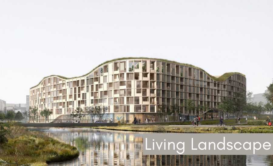 Это проект французского бюро Jakob+MacFarlane и T.ark, начатый как одна из 49 отдельных городских инициатив с нулевым уровнем выбросов, финансируемых всемирной сетью C40 Cities в рамках конкурса «C40: Изобретая города заново». Living Landscape представляет собой многофункциональное деревянное здание, расположенное на бывшей промышленной мусорной свалки в Рейкьявике. Использование сборных клееных брусов для строительства снижает объем выброса углерода здания почти на 80% по сравнению с типичным бетонным зданием. Эксплуатационные выбросы углерода сокращаются благодаря интегрированной системе рекуперации отработанного тепла, изоляции и источникам возобновляемой энергии. Этот проект служит моделью экосистемы для растущих мегаполисов и городов.