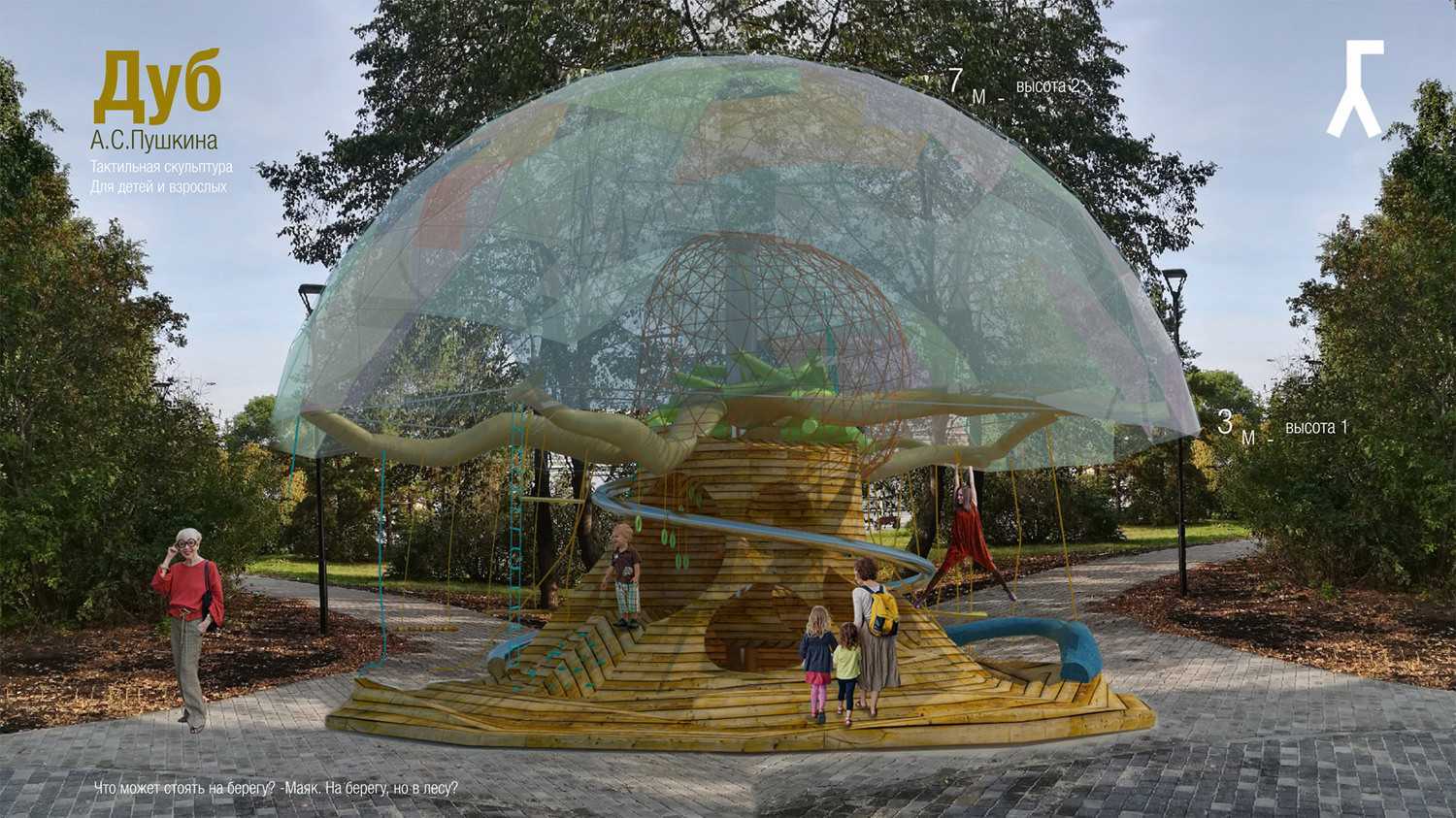 Вдохновением для проекта послужил образ сказочного дуба из пушкинского Лукоморья. На площадке имеются веревки для лазания и качели, огромное гнездо в ветвях, турники, шведская стенка, скалодром и другие приспособления для активного отдыха. Предполагается, что «дуб» будет оснащен медиасистемой, транслирующей классическую музыку и рассказы, в том числе сказки Пушкина.