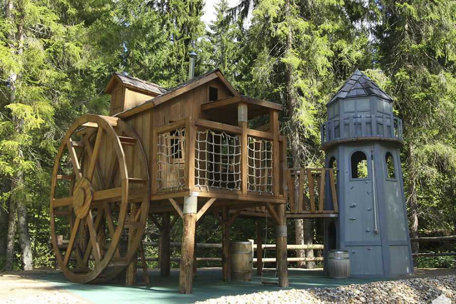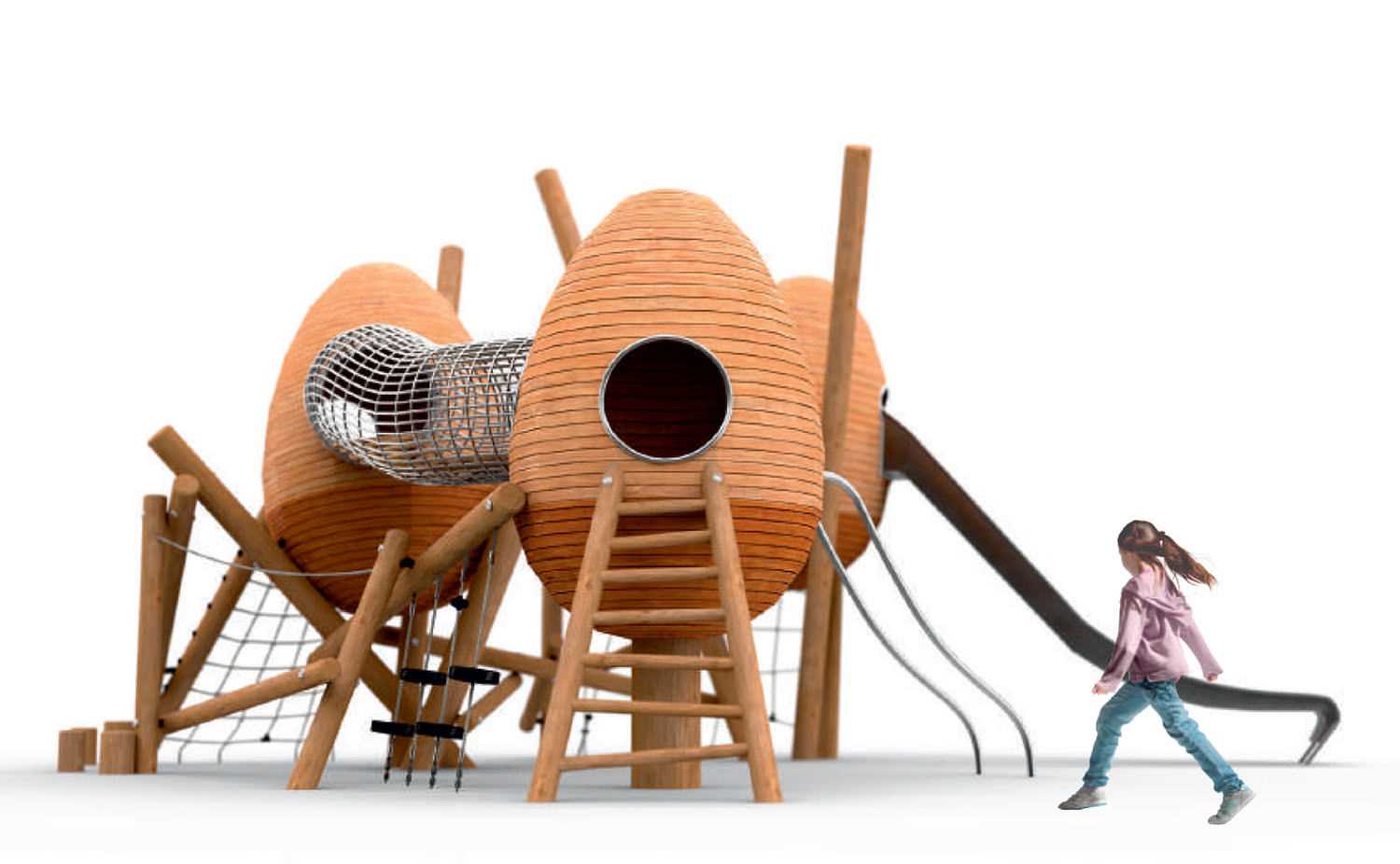 Детская площадка «Гнёзда» предлагает множество вариантов для игр: дети могут передвигаться по ажурным переходам, преодолевать полосу препятствий, взбираться по канатной сетке, а также спускаться с горок.