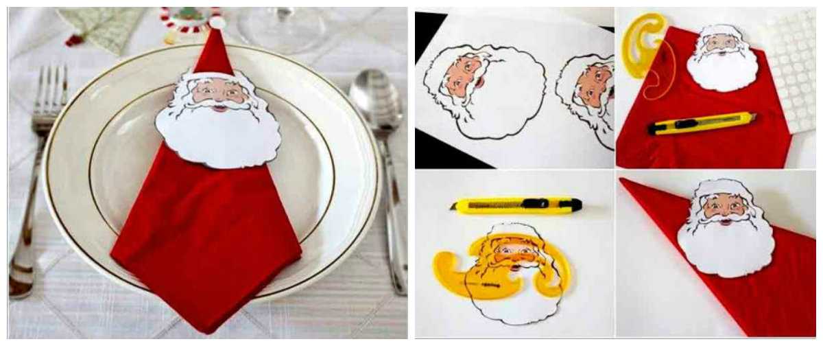 - Шапочка Санта-Клауса. Для того чтобы смастерить такой головной убор в миниатюре, необходимо сложить двухстороннюю салфетку в два раза (в итоге красная сторона должна оказаться внешней), отогнуть ее край по косой белой стороной наружу и свернуть кулечком, поставив получившийся колпачок на сервировочное блюдо.