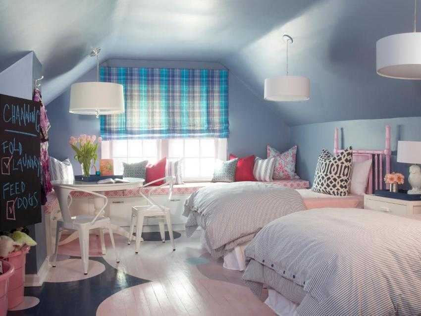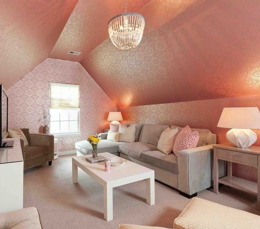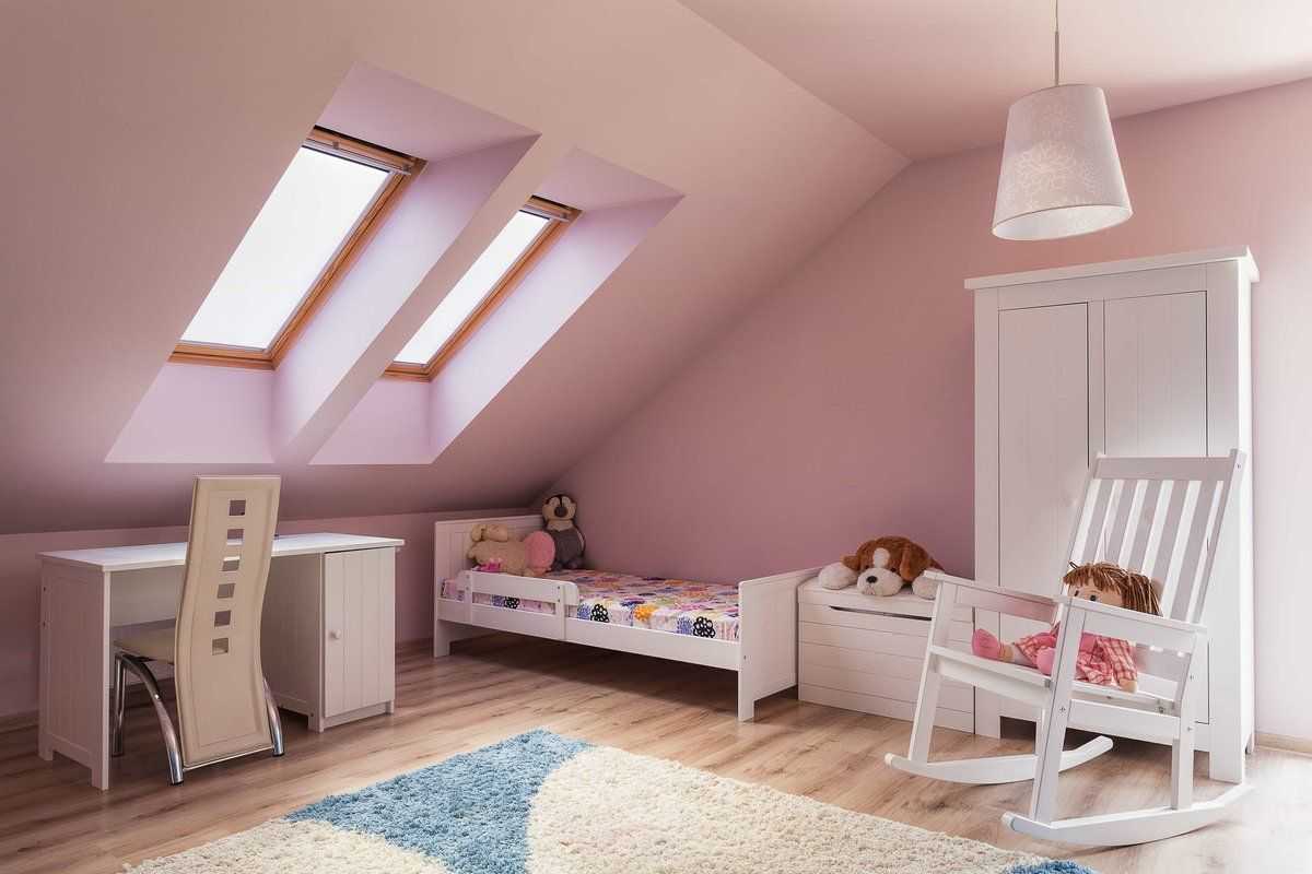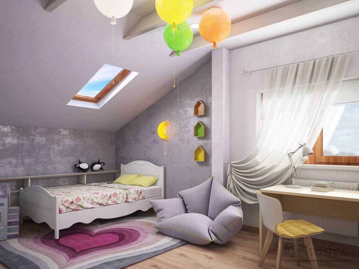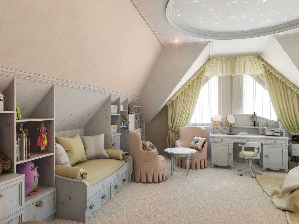Чердак прекрасно подойдет для создания уютного уголка принцессы. Оптимальным выбором для девочек, старше 7 лет становится , в котором найдется место для кровати, хранения одежды, книг и любимых мелочей. В качестве ярких акцентов могут быть использованы шторы с тематическим рисунком, деревянный пол, или покрывало с оригинальным орнаментом.