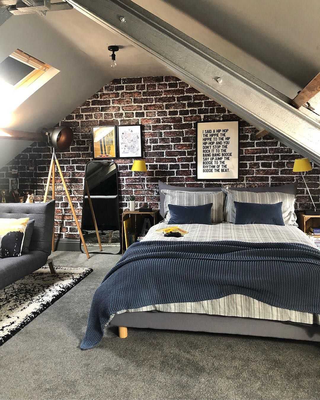 Серый и черный: интерьер спальни в стиле лофт с кирпичной стеной