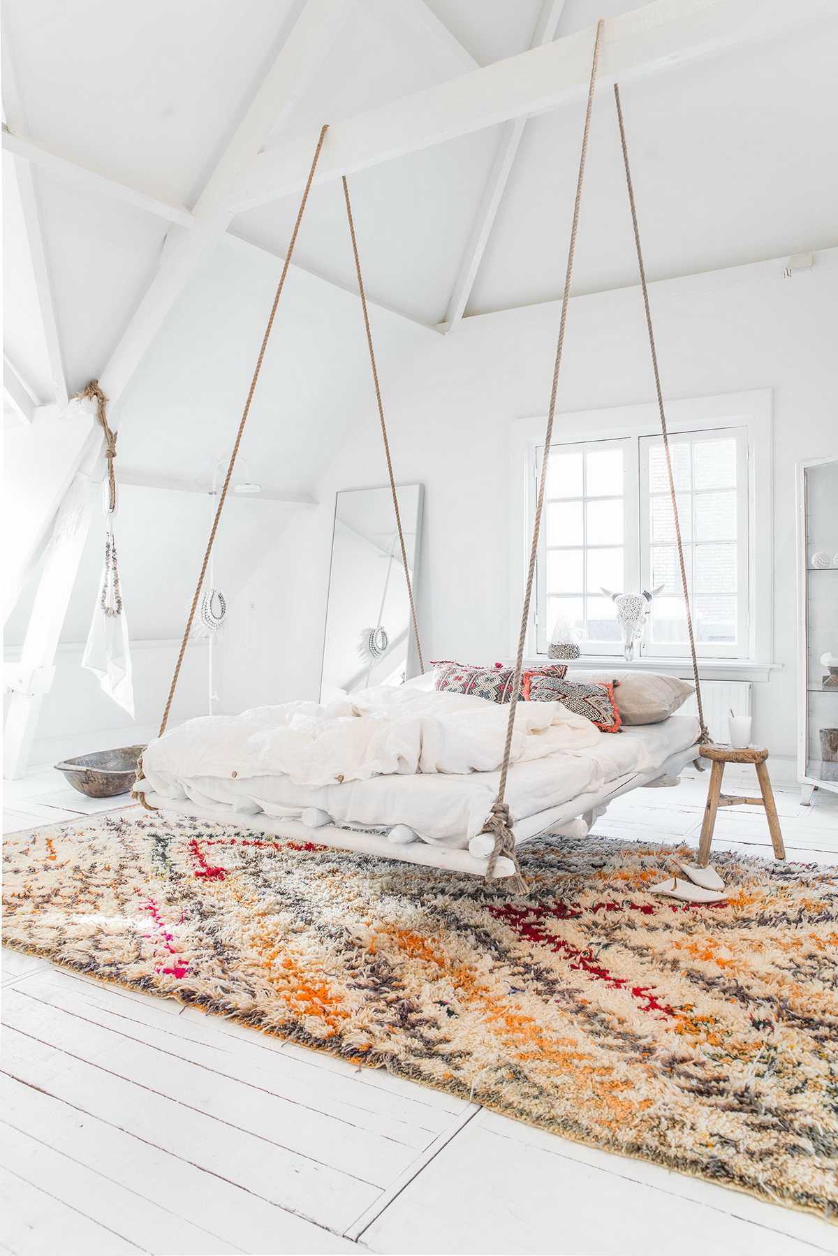 Наиболее эргономичный вариант – поставить ее изголовьем к стене пониже, желательно рядом с окном. Под скатом крыши создается эффект алькова, то есть защищенного пространства. А вечером прекрасные закаты и звездное небо наполняют мансардную спальню восторженной романтикой.