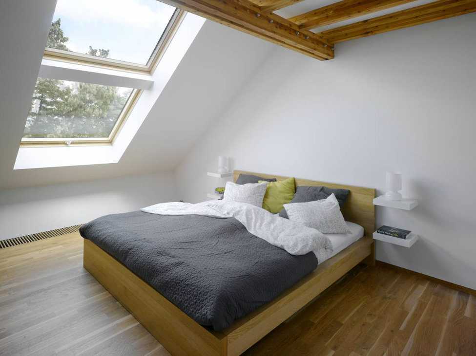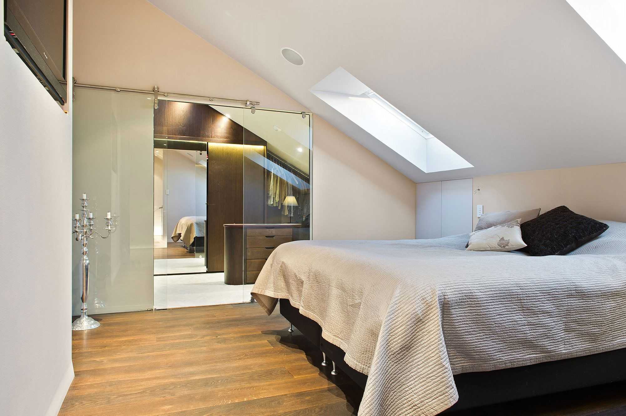 Впрочем, вовсе не обязательно иметь прозрачную перегородку, ведь если в мансарде 2 комнаты, то обе они могут стать абсолютно автономными помещениями, например, уединенной спальней, как представлено на прочих фото подборки, снабженной собственной просторной ванной за стеной или просторной гардеробной своими руками.