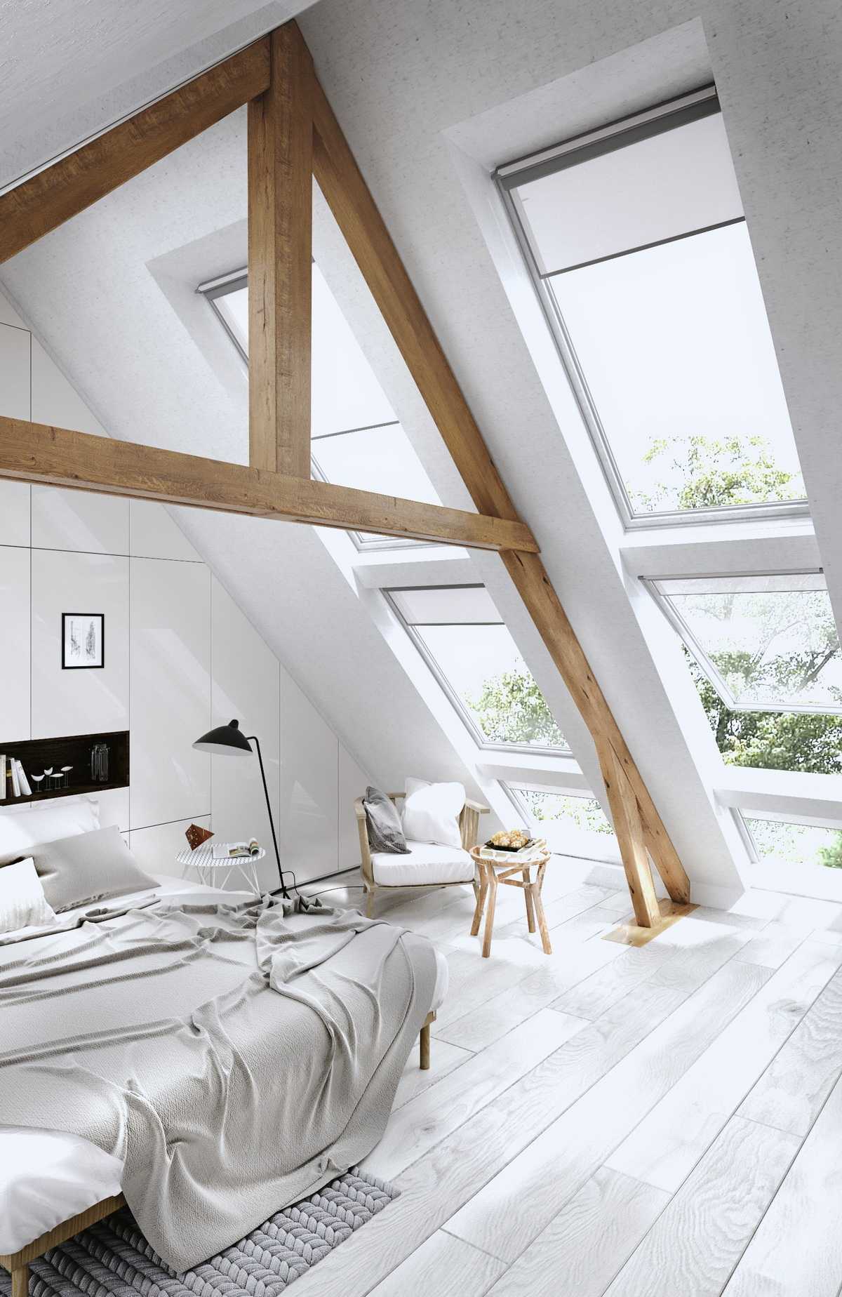 Чтобы правильно задекорировать опоры на потолке мансарды своими руками, потребуется вписать их в общий стиль интерьера. Можно придать им яркости либо смягчить обстановку неброскими тонами. Большое количество окон в спальне, как на фото, позволит владельцу мансарды ежедневно наслаждаться видом на природу.