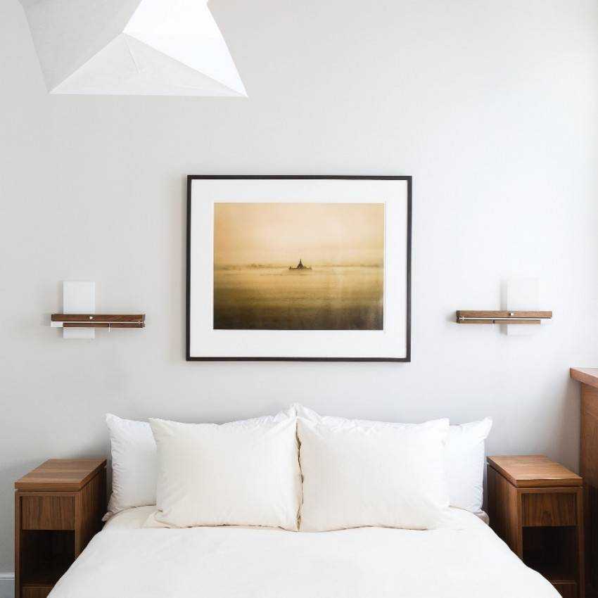 Однако не все предметы мебели стоит обязательно использовать. Их количество может варьироваться в зависимости от площади помещения. Например, если вы оформляете дизайн интерьера маленькой спальни, то в таком случае вполне вероятно, что вместо прикроватных тумбочек оптимальным вариантом станут навесные полки.