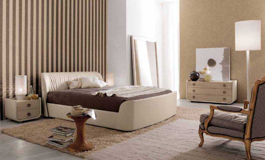 Если спальня длинная и узкая, то продольные полосы на одной из стен сделают пространство зрительно шире. Аналогично в комнате с невысокими потолками, вертикальные линии увеличивают высоту помещения.