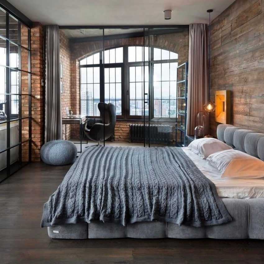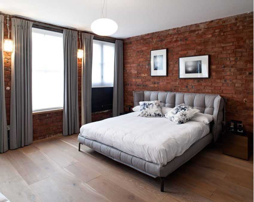 В лофт-стиль замечательно впишется кирпичная стена. В спальне она будет символом романтичности, творчества и брутальности. Эти качества достигаются с помощью цвета кирпича и текстур.
