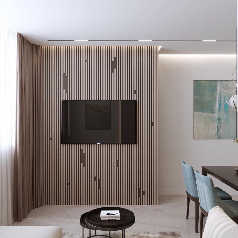 Для модерна хорошо подойдут геометрические формы. Светлые варианты выглядят более стильно, но скромно, чем темные. Можно дополнить такую отделку подсветкой, чтобы придать комнате загадочность. Если гостиная просторная, можно оформить материалом большую часть стены или даже несколько стен.