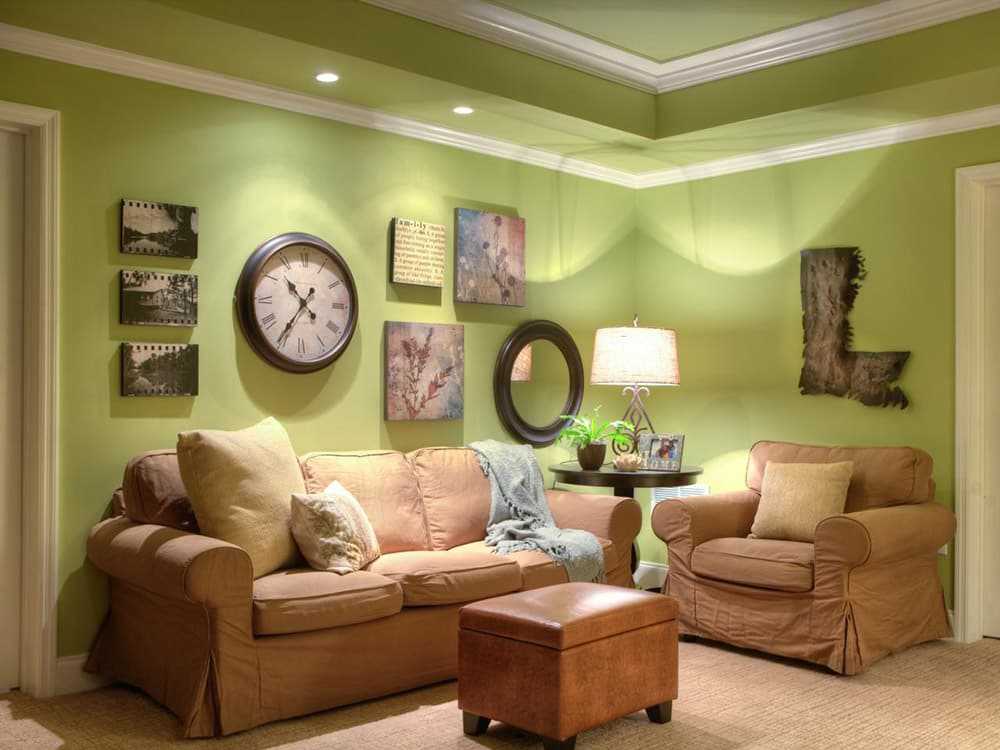 Сочетание зеленого цвета в интерьере также можно найти в виде готовых решений. Если, например, взять светло-зеленый оттенок, то отличный результат получится при использовании его с баклажанным, фиолетовым, бордовым, теплым желтым и оранжевым оттенком. Последнее время весьма популярен нежный мятный тон, который отлично гармонирует с белым, серебристым и светло-коричневым тонами.