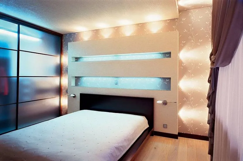 Спальня в стиле хай-тек с подиумной кроватью и подсветкойИсточник blueridgeapartments.com