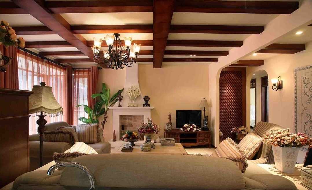 В типичном американском жилье почти нет места ковру или ковролину. Если его используют, то для оформления спальни. Часто американцы комбинируют в интерьере разные типы покрытий, чтобы зонировать помещение. Эту же функцию выполняют арки, колонны, другие аналогичные конструкции, не мешающие проникновению света. Потолок чаще всего имеет белый, бежевый или кремовый оттенок. Его могут украшать коричневые балки или молдинги, совпадающие по цвету с основной поверхностью и выполненные, как правило, из МДФ.