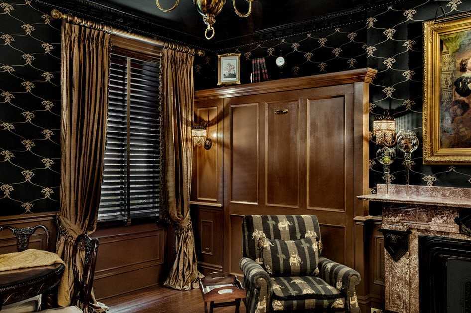 Мебель-трансформер в традиционном интерьере. Сегодня вряд ли кого-то удивишь мобильной стеной или подъемной кроватью в современном интерьере, но технологии могут неплохо вписаться и в историческую концепцию дизайна. В этой компактной комнате-студии с богатым прошлым частично восстановили обстановку, а откидную кровать гармонично вписали в единое пространство и спальни, и гостиной, спрятав ее за благородным деревянным фасадом.