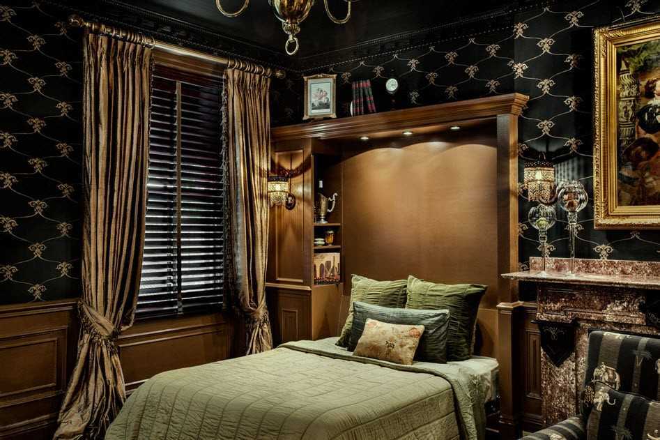 В спальне могут присутствовать синие и малиновые оттенки. Отлично подходит декор в цвете позолоты или металла. Эти цвета идеально сочетаются с базовой палитрой стиля. В интерьере также приветствуются контрастные сочетания: