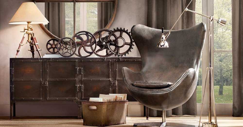 Кожа, стекло, металл и дерево выглядят добротно, вписываются в стиль лофт. Царапины и щербины, гвозди и изолента подчеркнут оригинальность стиля.