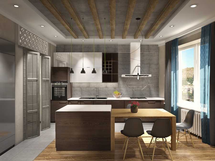 Полы укрывают плитами под камень, наборными досками или используют наливные под бетон. Оптимально будет использовать систему для обогрева пола – это экономично и достаточно комфортно. А с помощью ковриков небольших размеров можно разделить помещение на зоны.