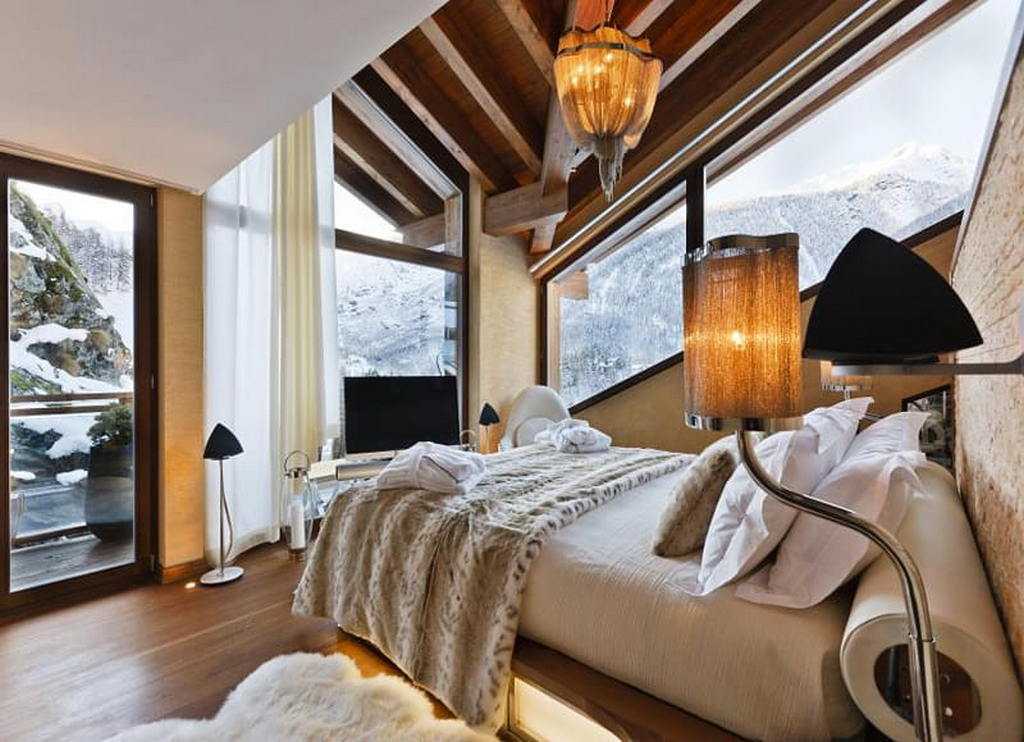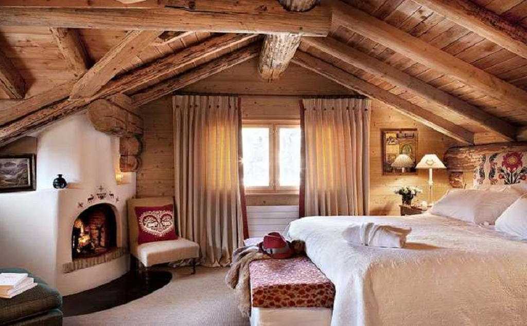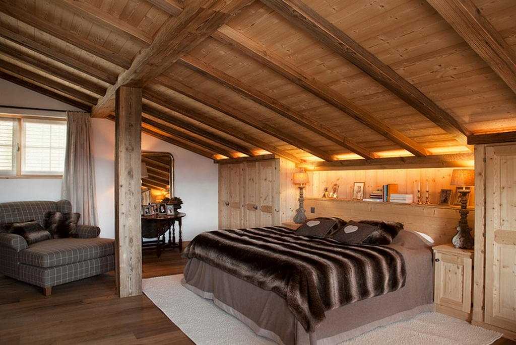 Экологичность и аскетичность стиля шале как нельзя лучше подходят для комнаты отдыха. Дерево дышит и поддерживает здесь благоприятный микроклимат. Ничего не раздражает и не мешает уснуть. Идеальное место для размещения спальни – мансарда с великолепным видом из окна.