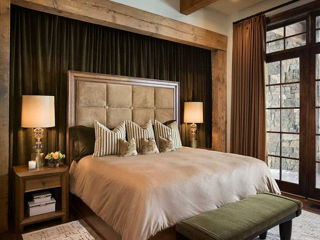 Свечи, шкатулки, живые цветы привносят сентиментальную нотку в композицию спальни. Стены украшаются картинами с изображением горных пейзажей. Очень стильно над кроватью смотрятся рога или чучело оленя.