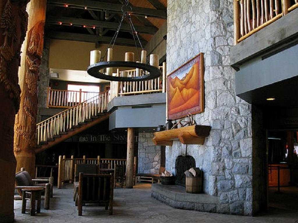 Стены зашиты деревом, чаще всего панелями из бруса. Зона вокруг камина декорирована природным камнем с минимальной обработкой.