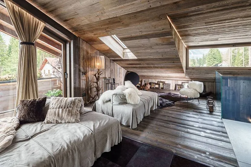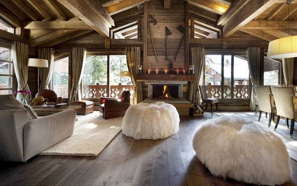 Как вы видите, большинство шале имеет множество натуральных материалов, таких как дерево и камень, а также кожу в составе мебели, а затем мех и шерсть в аксессуарах.