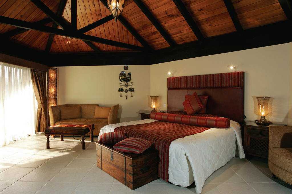 Потолочные навесные конструкции обнажены. Деревянные круглые или квадратные балки, в виде колонн подпирающие потолок, хорошо смотрятся в очень просторных помещениях.