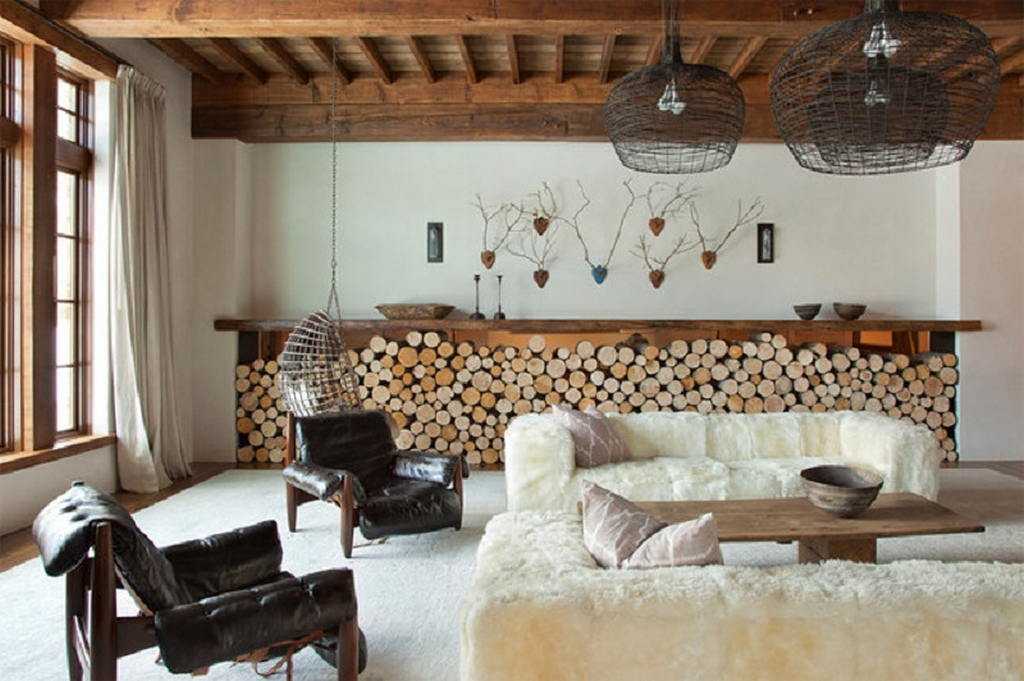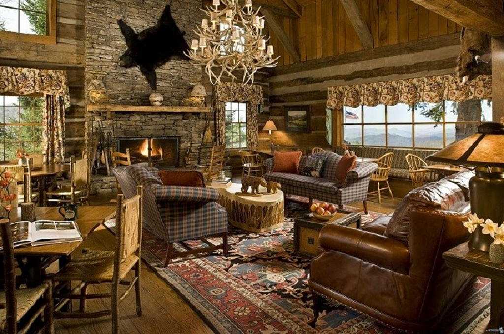 Для таких домов характерен лаконичный дизайн, предметы декора ручного производства, грубая массивная деревянная мебель, добротные диваны и кресла, плетенная мебель, настоящий камин или другой вид очага, потолок с крупными деревянными балками чаще темного цвета.
