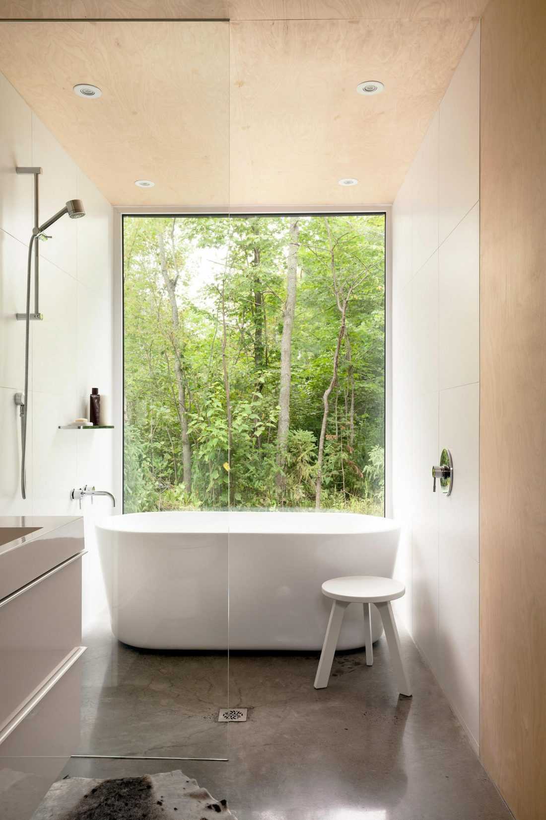 Вторая часть кухни идеальна встроена в стену фанерного короба, скрывающего личные апартаменты владельцев дома. Лаконичность, естественность, экологичность – черты, которыми в целом можно охарактеризовать обстановку этой части дома. Принимая ванну, можно наслаждаться видом из окна, а широкая кровать в спальне располагает к комфортному отдыху.