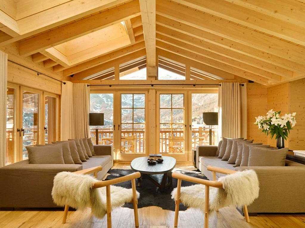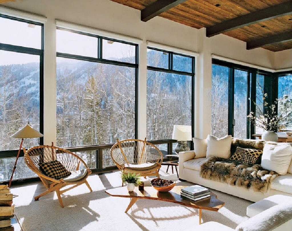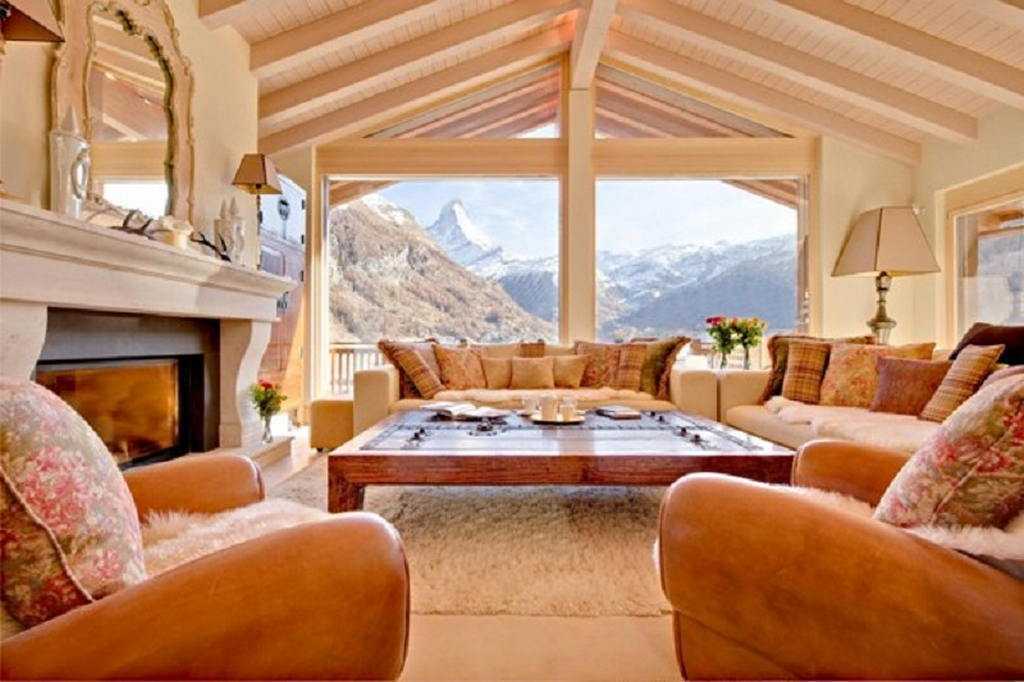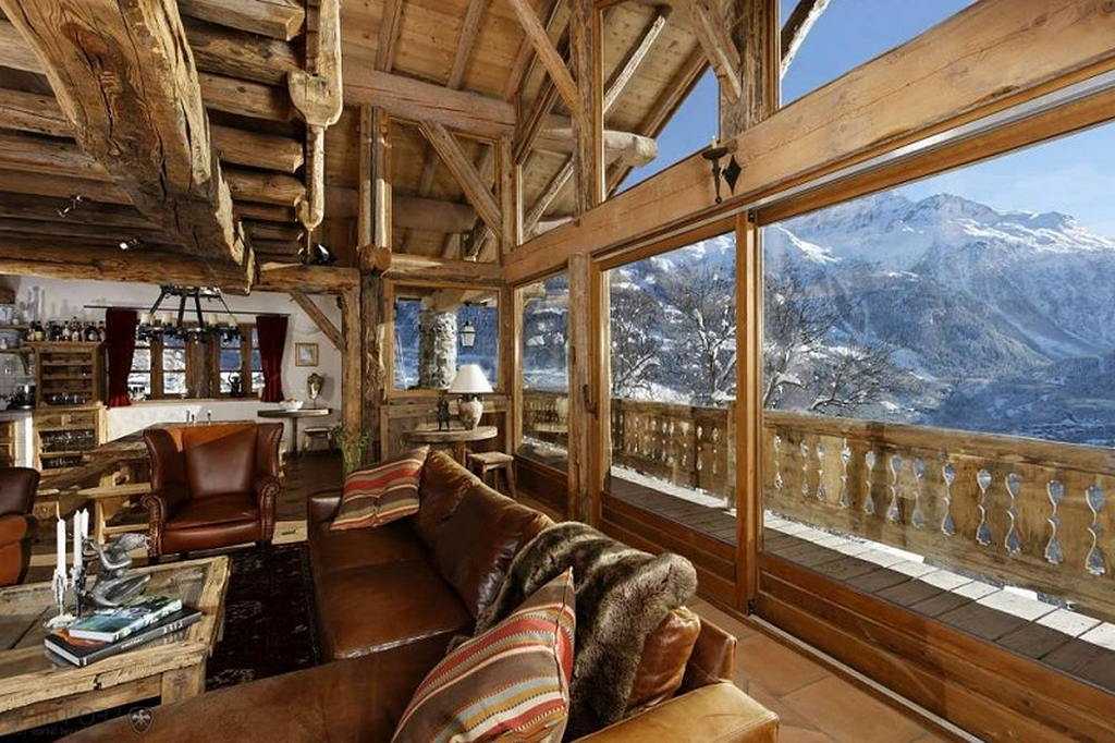 Как вариация в стиле шале, в качестве гостиной может использоваться застекленная веранда или огромный балкон. В этом случае домочадцы и гости могут свободно наслаждаться местными пейзажами потрясающей красоты.