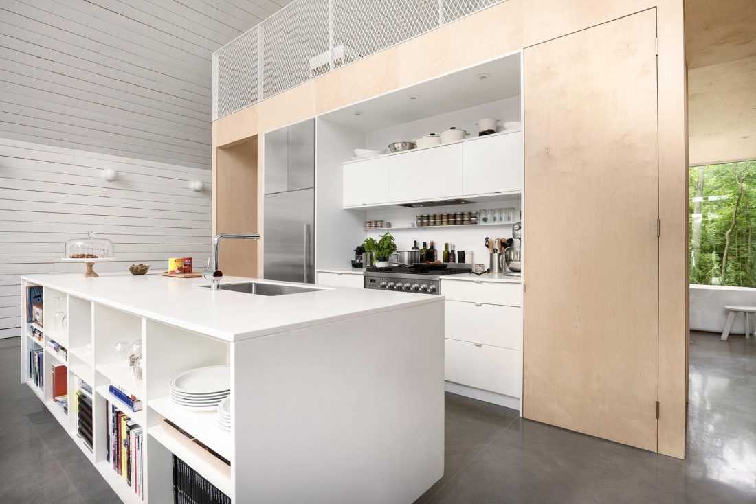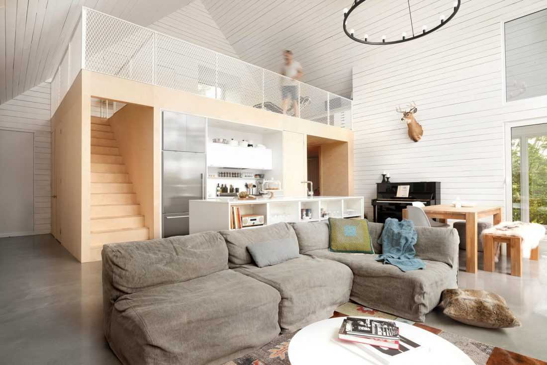 Внутри дом разделен на две части. Первая занимает большую часть пространства и абсолютно открыта. Здесь обустроены кухня, столовая и гостиная.