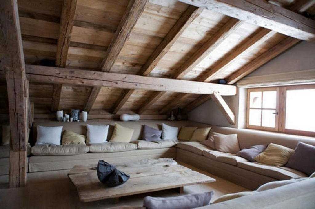 Мягкую мебель выбирают из состаренной кожи без блеска. Диваны и кресла покрывают разноцветными покрывалами. В мансарде в стиле шале обязательно должны быть подушки, вышитые салфетки. Стены украшают охотничьими трофеями.