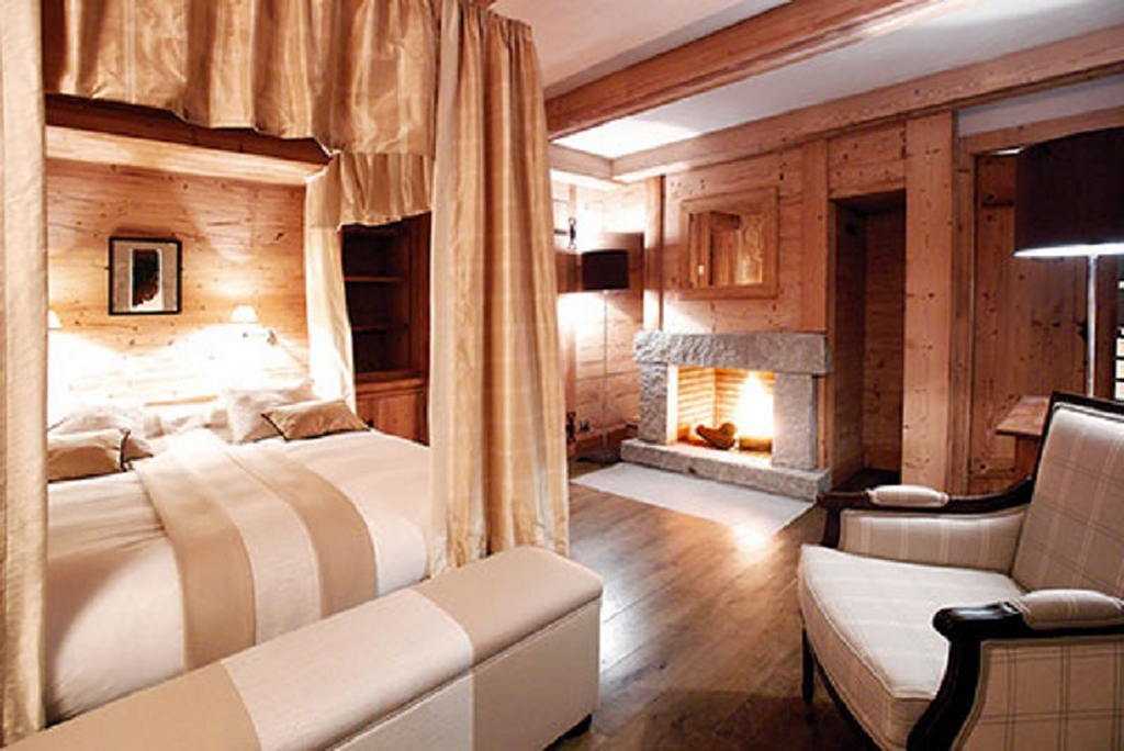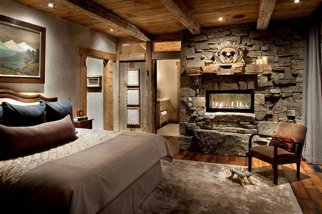 Камин очень часто встречается и в современных спальнях в стиле шале. Правда, его функции теперь чаще всего чисто декоративные. Зона вокруг камина облицовывается камнем.