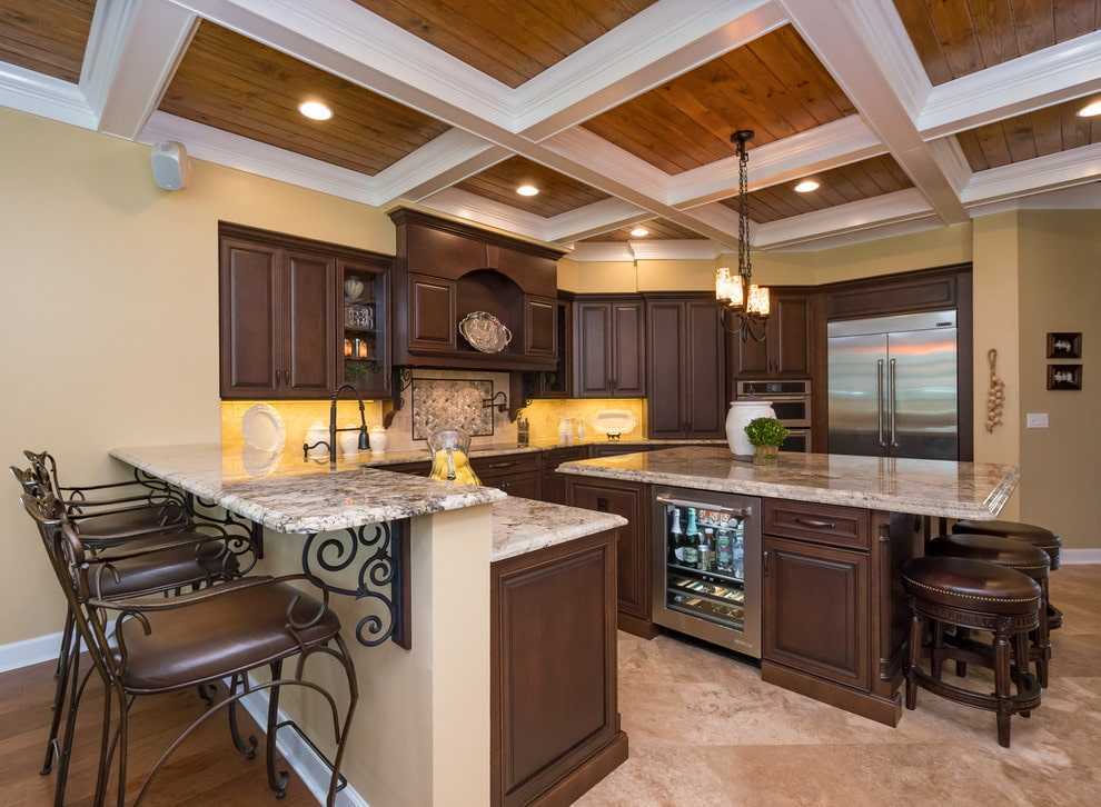 - В деревянном доме нередко устанавливают кессонные потолки. Это объемная отделка из перпендикулярно расположенных балок, формирующих ячейки. Балки выкрашивают в более темный цвет или делают светлее по сравнению с основанием. За счет контраста удается визуально увеличить высоту потолка.